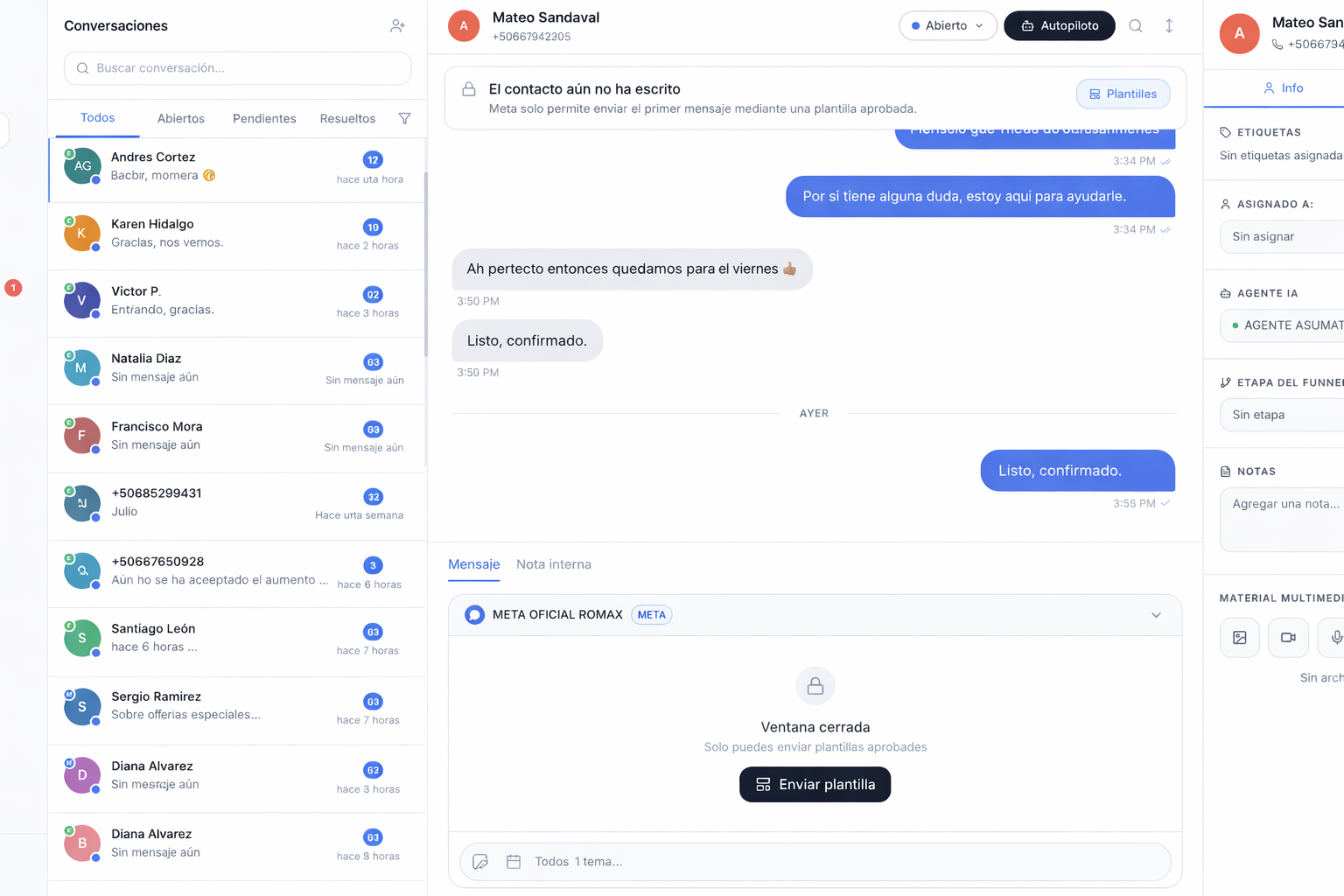Gestiona tus relaciones con clientes directamente desde WhatsApp. Automatiza, personaliza y escala tu negocio con ROMAX.